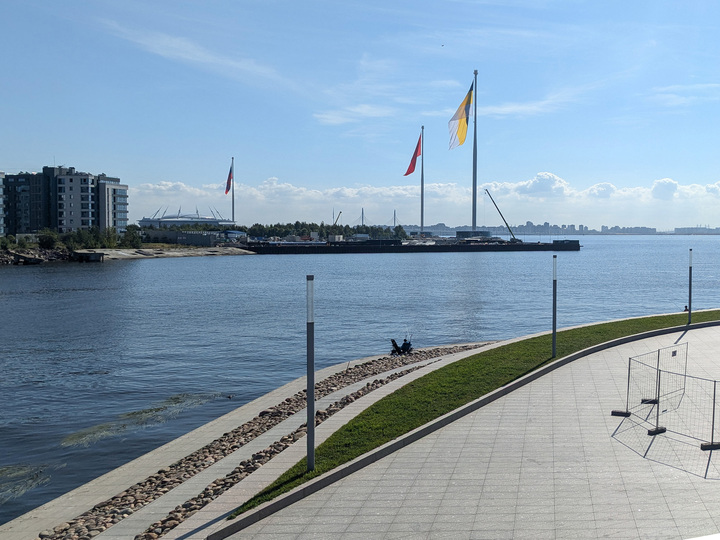 29 августа, 11:30. Несмотря на раннее время и будний день, на набережной у «Лахта Центра» довольно людно: люди прогуливаются по озелененному пространству у воды и греются на солнце, сидя на деревянных скамьях. Новые посетители общественного пространства «Открытая набережная» прибывают сюда по Прозрачному мосту — пешеходной переправе через Лахтинскую гавань, которую открыли весной 2023 года вместе с автомобильным Кристальным мостом.