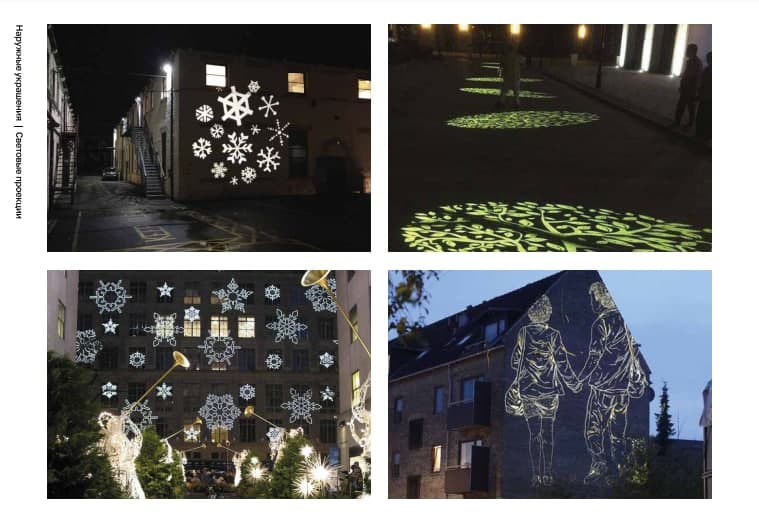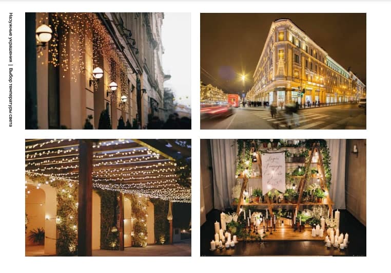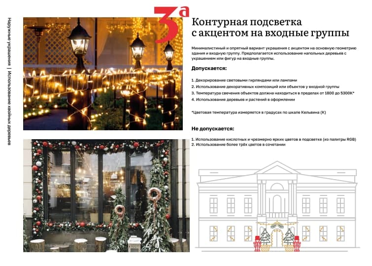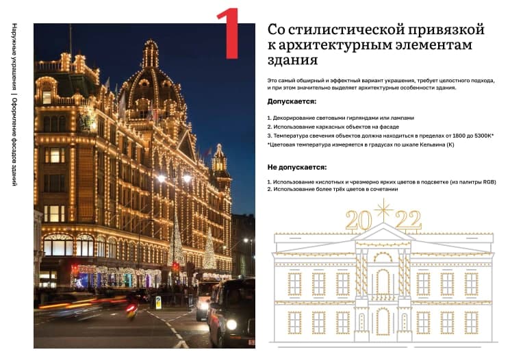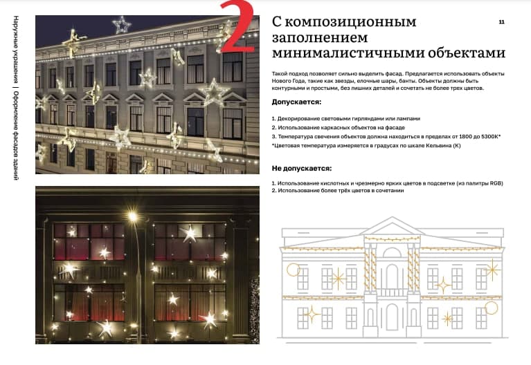 Например, брендбук не допускает использование синего цвета в освещении, но предлагает в зависимости от величины зданий выбирать обширное украшение со стилистической привязкой к архитектурным элементам, умеренное украшение с композиционным заполнением минималистичными объектами либо упрощенное украшение с контурной подсветкой с акцентом на входные группы.