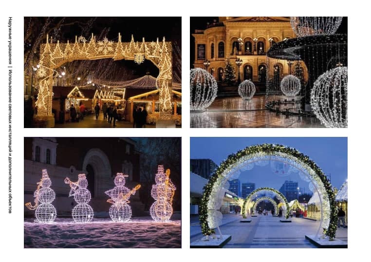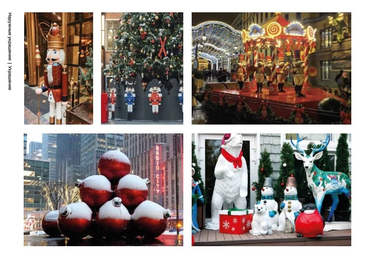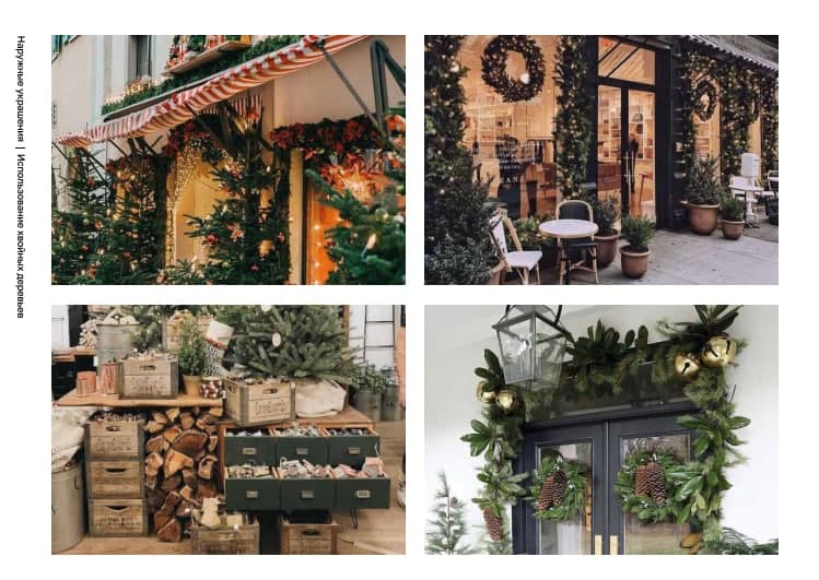 Брендбук рекомендует использовать в оформлении города хвойные деревья. Каждую входную группу предлагается украшать хвойными ветками с игрушками, листьями, ягодами омелы и так далее.