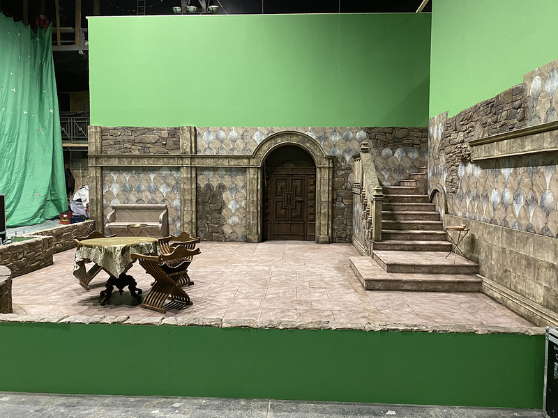 Видео со съемок сериала в павильонах «Ленфильма» в инстаграме опубликовала Екатерина Волкова. Можно увидеть декорации, актеров и зеленый фон, который после станет стенами замка.