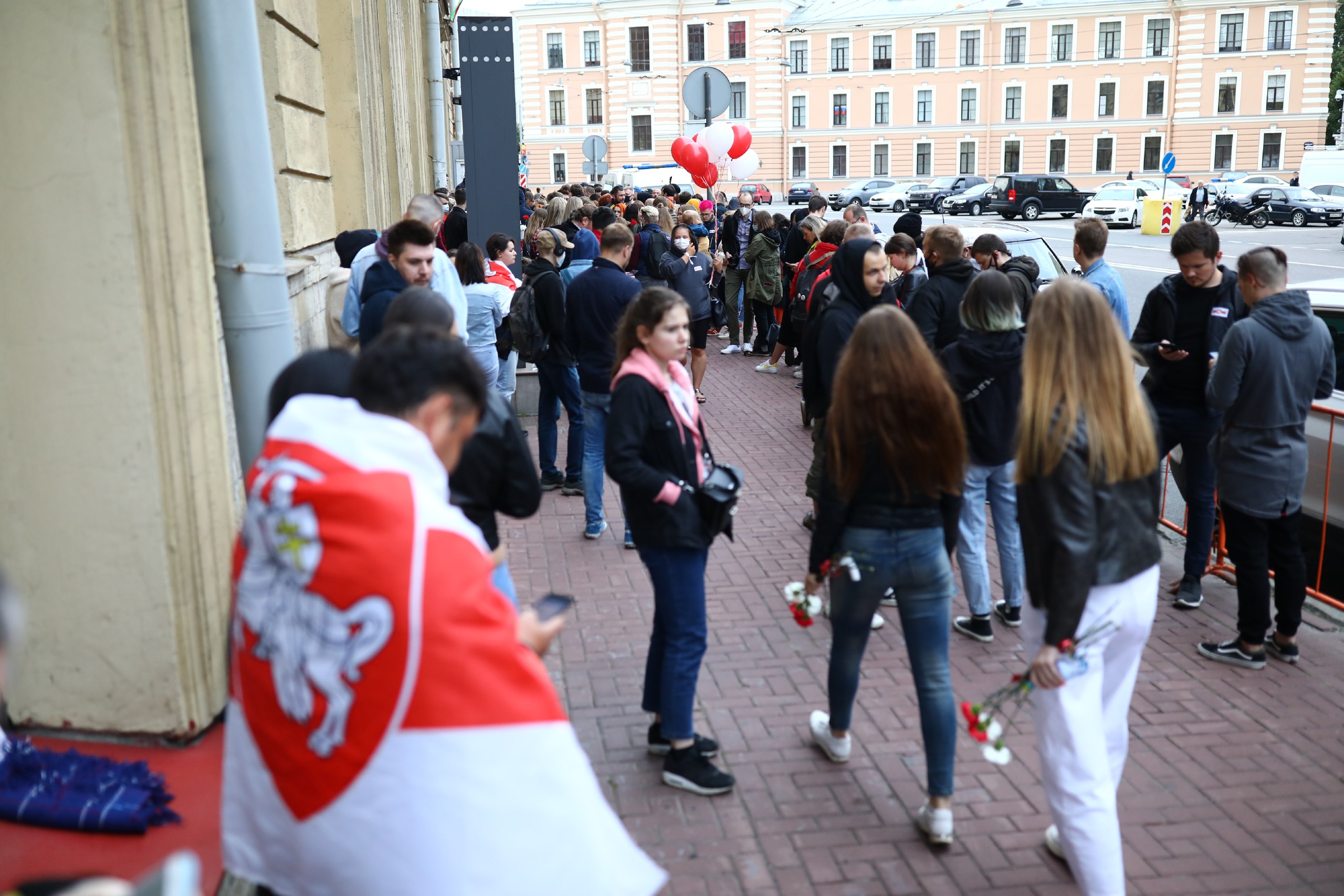 У отделения посольства Беларуси в Петербурге второй день подряд проходит акция солидарности с белорусскими гражданами, протестующими против итогов президентских выборов. Туда пришли сотни человек, сообщают очевидцы. Люди возлагают цветы и стоят с плакатами. «Бумага» показывает снимки с акции.