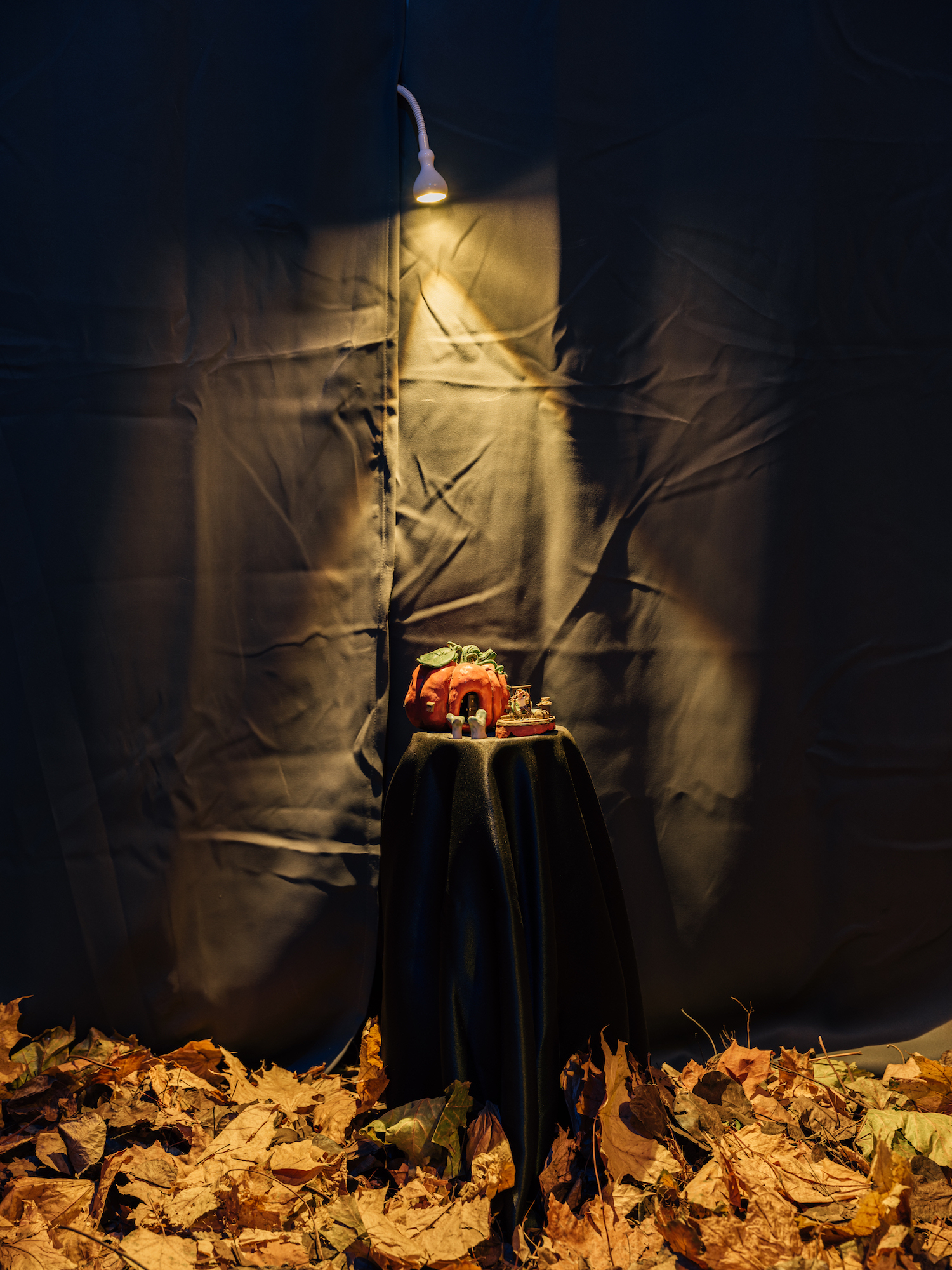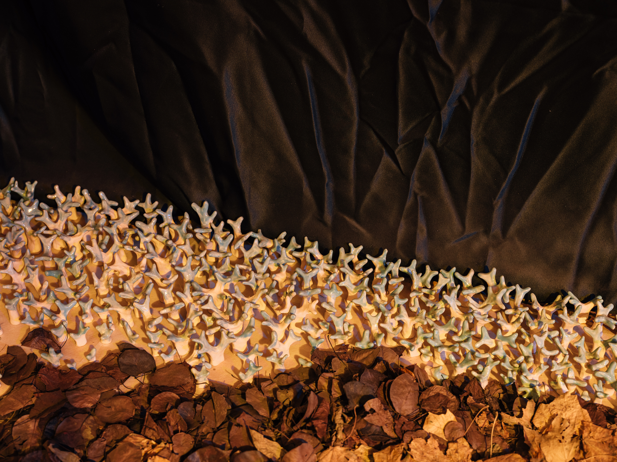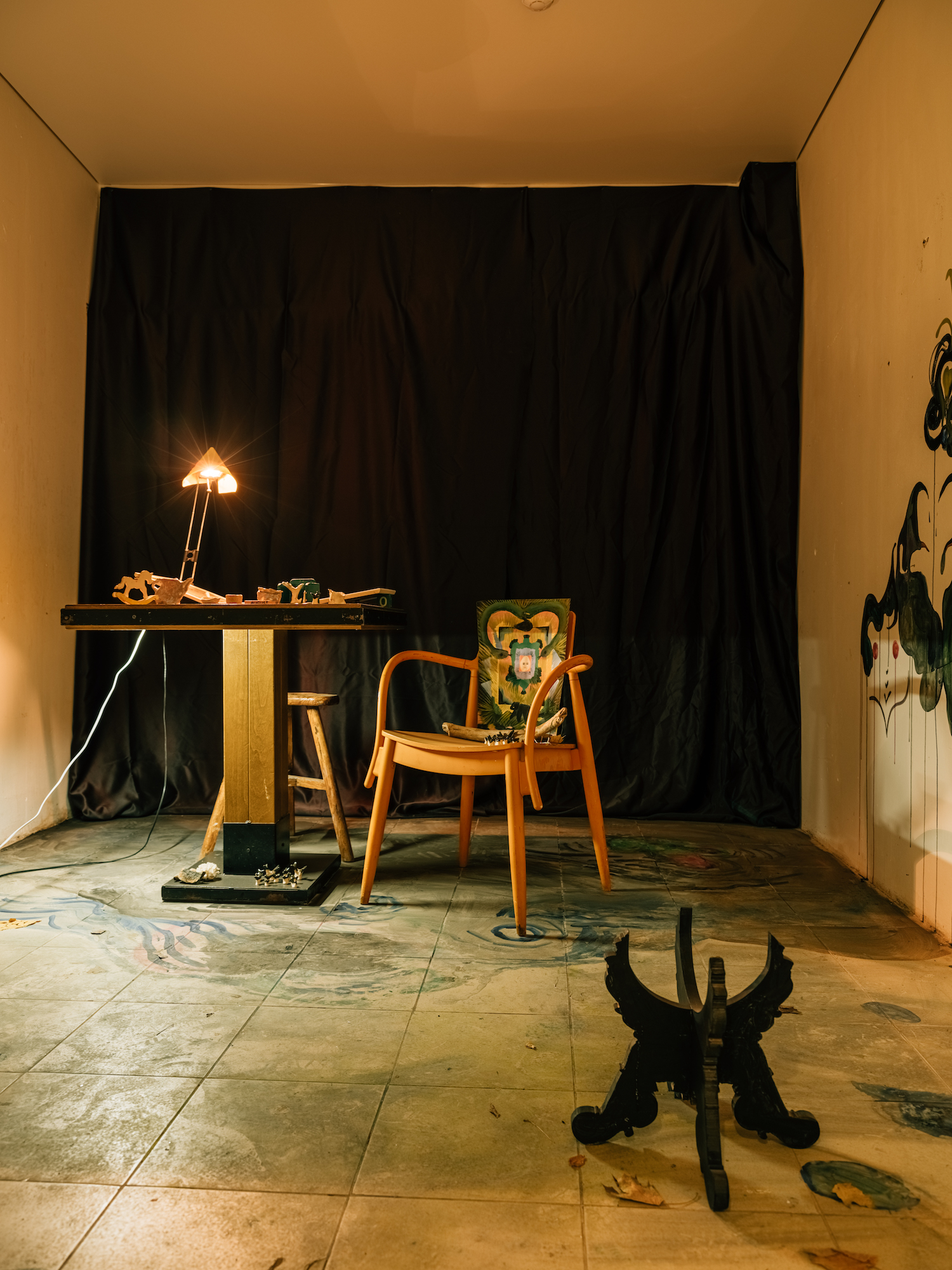 В служебном помещении «Лавки художника» на Невском проспекте, 8 проходит «Тайная выставка». Пол небольшого пространства застелен настоящей опавшей листвой — для этого понадобилось восемь мешков листьев. Стены декорированы тростником.