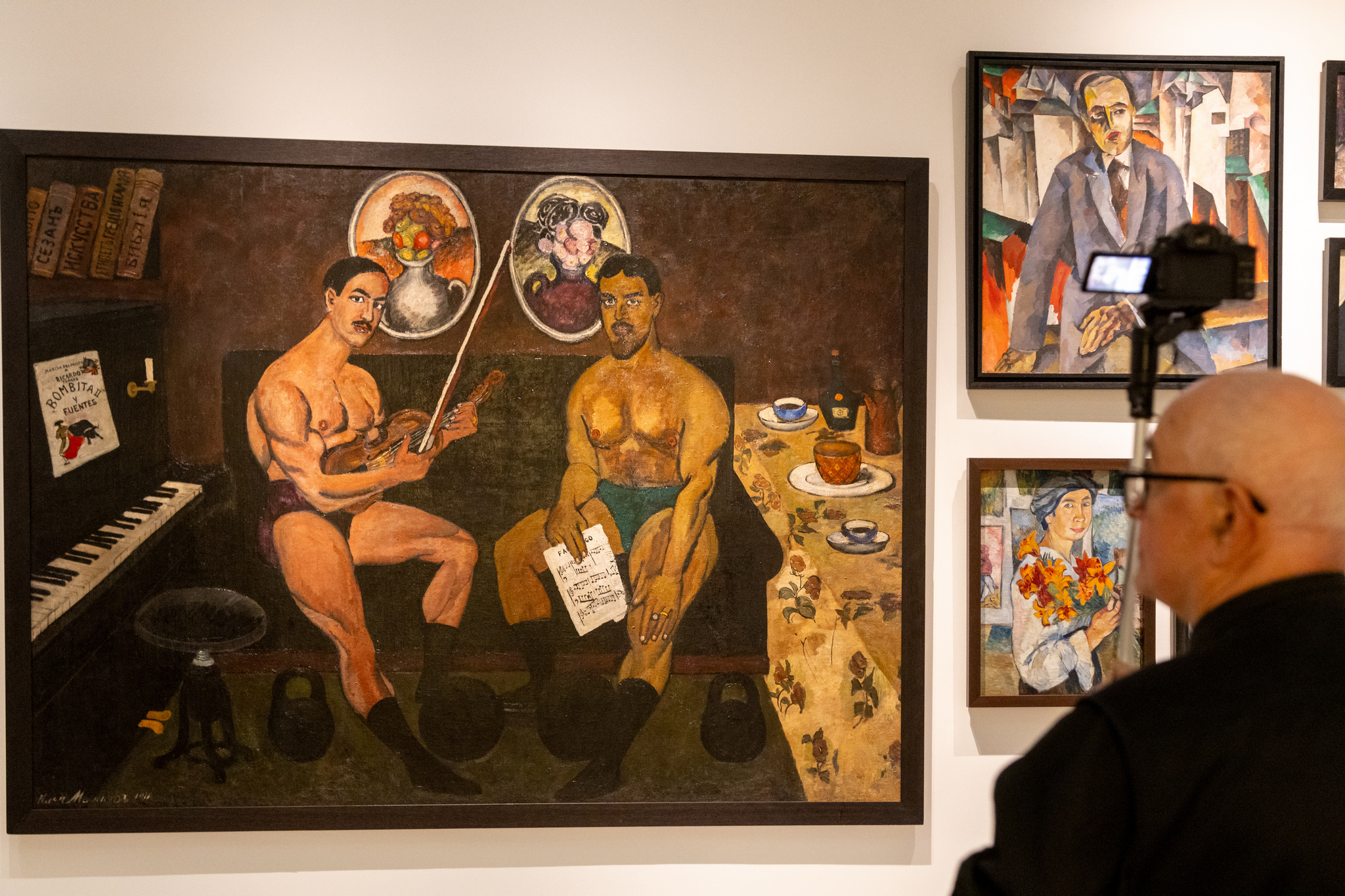 Новая выставка Русского музея заняла 20 залов на втором этаже корпуса Бенуа — каждый из них посвящен определенному направлению русского авангарда. Например, в первом зале можно увидеть авангардные портреты — среди прочего там есть картина Ильи Машкова «Автопортрет и портрет Петра Кончаловского», на которой атлетически сложенные художники в плавках собираются музицировать (Машков держит в руках скрипку, Кончаловский — нотный лист).