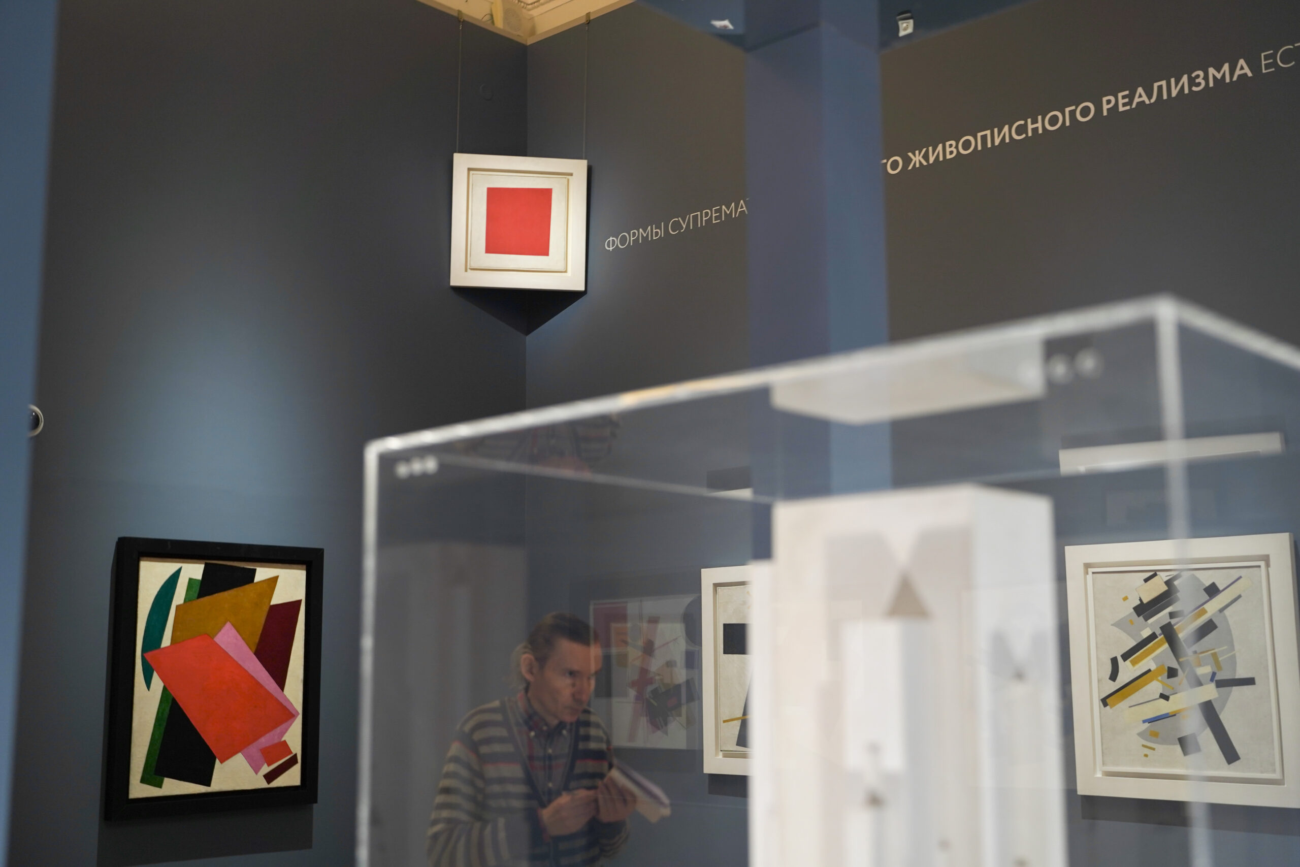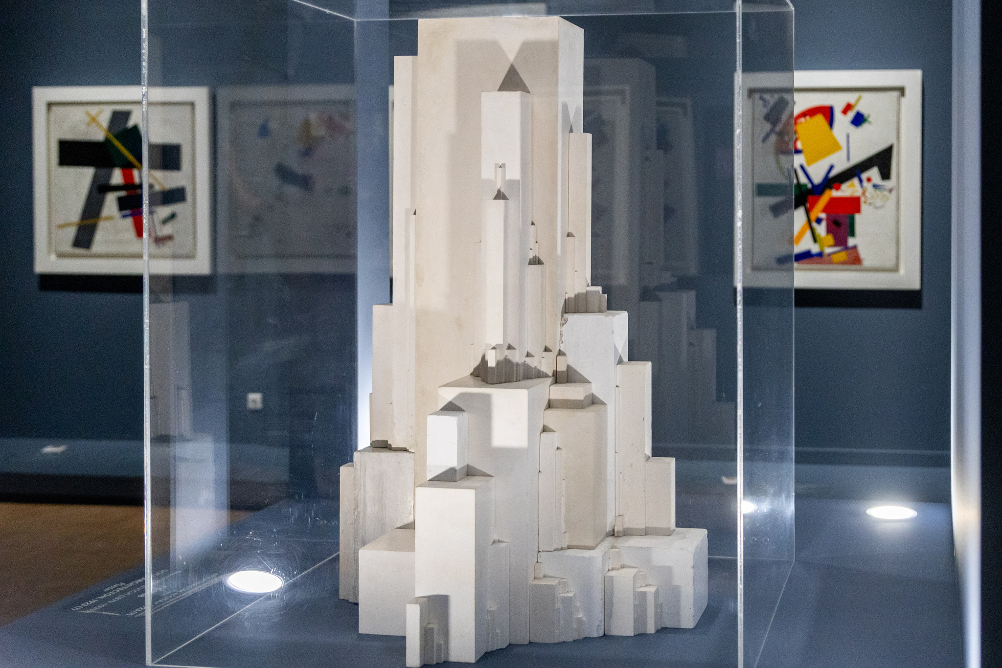 Главный визуальный акцент — стенды в центре залов, некоторые из них подсветили холодным белым цветом. Там выставили «Пир королей» Павла Филонова, «Зеленую полосу» Ольги Розановой, гипсовый архитектон Казимира Малевича и другие экспонаты.