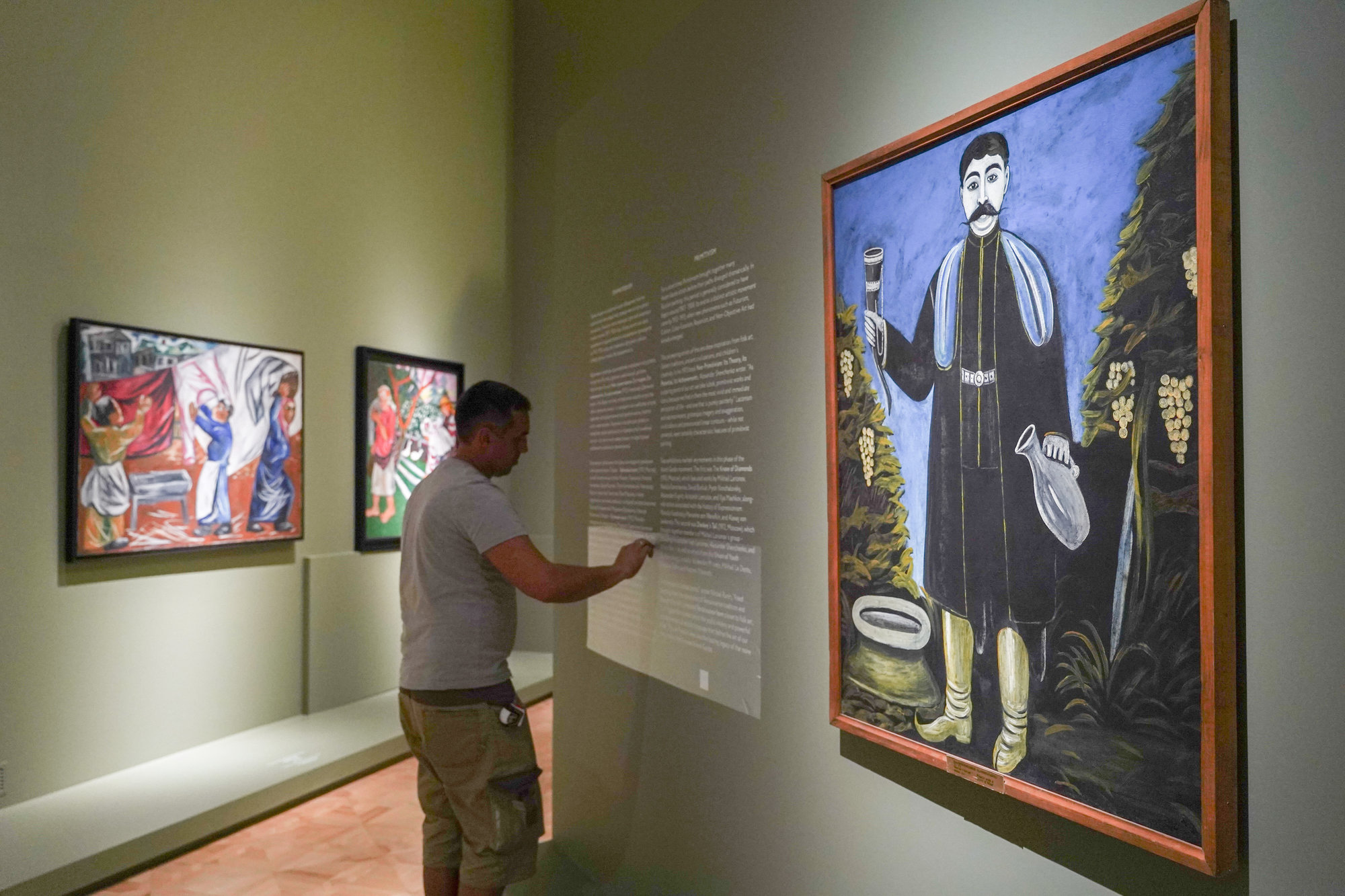 Соседний с «Бубновым валетом» зал показывает примитивистские работы авангардистов. Этот период в русской авангардной живописи был недолгим — его началом считаются 1907-1908 годы, но уже в середине 1910-х примитивизм в целом уступил место другим течениям, от кубизма до беспредметности. Это видно на примере творчества Александра Древина: на выставке представлены его ранние работы, «примитивы» из цикла «Беженки». Хотя этот автор работал и с экспрессионизмом, и с беспредметной живописью, а в 1920-х перешел к более классическим формам. Но есть в зале и убежденный примитивист: это Нико Пиросмани с холстом «Князь с рогом вина».