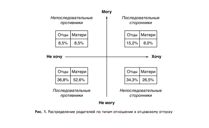 — В основном да. Но процент домохозяек и тех, кто по другим причинам не работает, тоже довольно высок. Поэтому они и не хотят передавать эту функцию мужчинам: они сами с ней справляются, и им это в большей степени нравится. И как оказалось, здесь большой процент женщин, которые не доверяют отцам. Вторая группа — непоследовательные противники. В нее входит две полярные группы: мужчины с высшим образованием и те, кто закончил только школу или лицей. Здесь мужчины говорят, что и отцы, и матери должны участвовать в воспитании, но признают, что сами достаточно пассивны. Ну и они достаточно прагматичны: говорят, что в отпуск нужно идти тому, кому это выгодно.