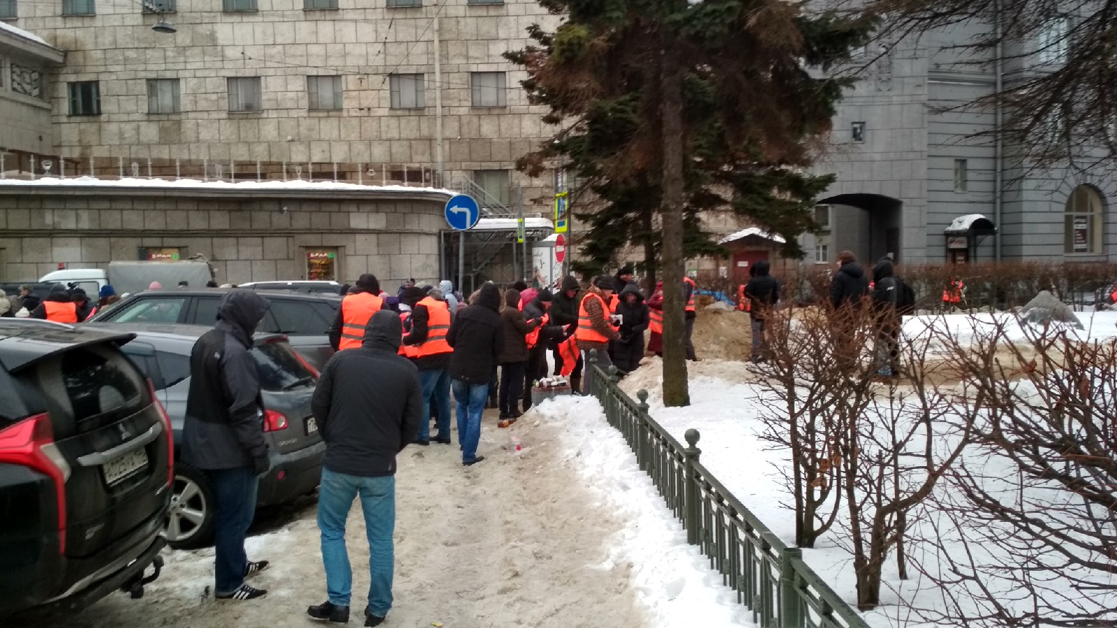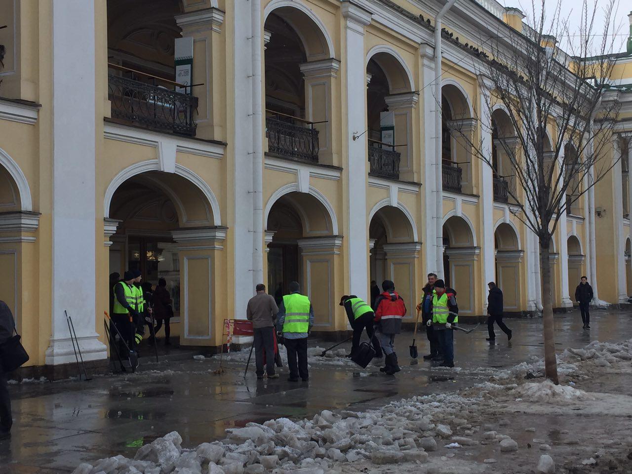 Субботник прошел и на Невском проспекте. Территорию у Гостиного двора очищали от снега десять крепких мужчин в жилетах с надписью «Поисково-спасательная служба». «Бумаге» они рассказали, что работают с 10 утра и «немного устали»: