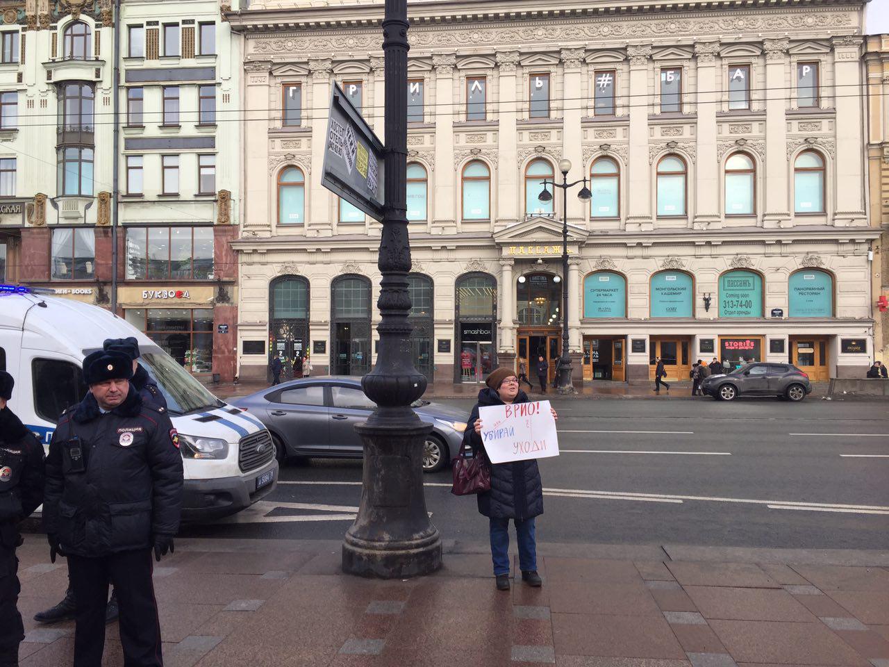 В это же время в 50 метрах от группы мужчин проходят одиночные пикеты против плохой уборки улиц. Около десяти человек вышли на призыв движения «Красивый Петербург». На одном из плакатов участников надпись: «Врио! Или убирай или уходи». За акцией лениво наблюдали трое полицейских.