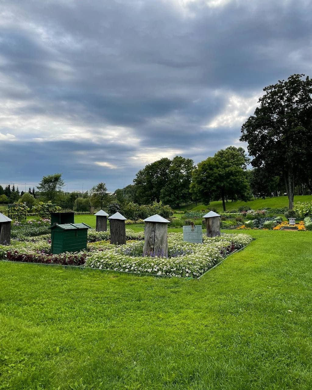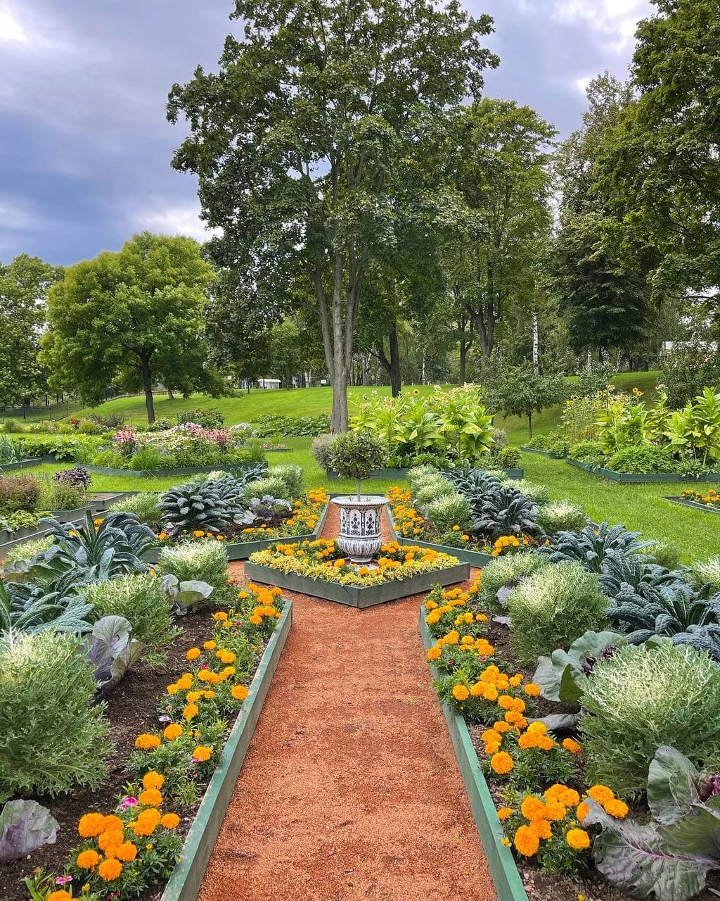 Часть небольшой, но очень опрятной придворцовой территории — императорский огород «на голландский вкус». Грядки здесь размечены в соответствии с заветами императора Петра, а овощи, ягоды и травы растут вместе. Получаются необыкновенные клумбы — например, из разных видов капусты и бархатцев.