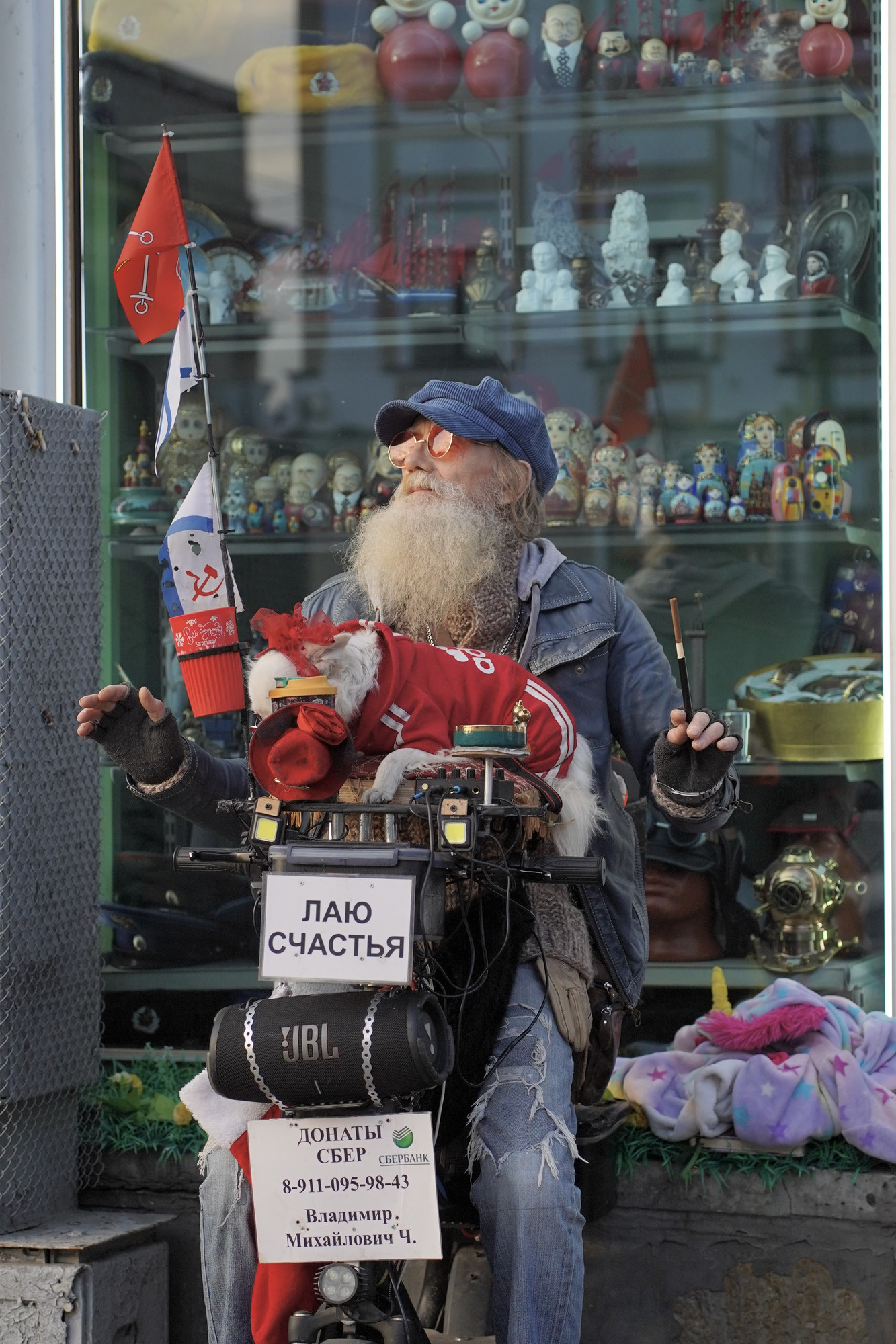 В центре Петербурга уже лет десять можно встретить Владимира Михайловича — невозмутимого седовласого уличного артиста в розовых очках — и его белую собачку Беллу. Они ездят по городу на скутере под советские песни, выступают и создают атмосферу свободного, меланхоличного и немного безумного Петербурга.