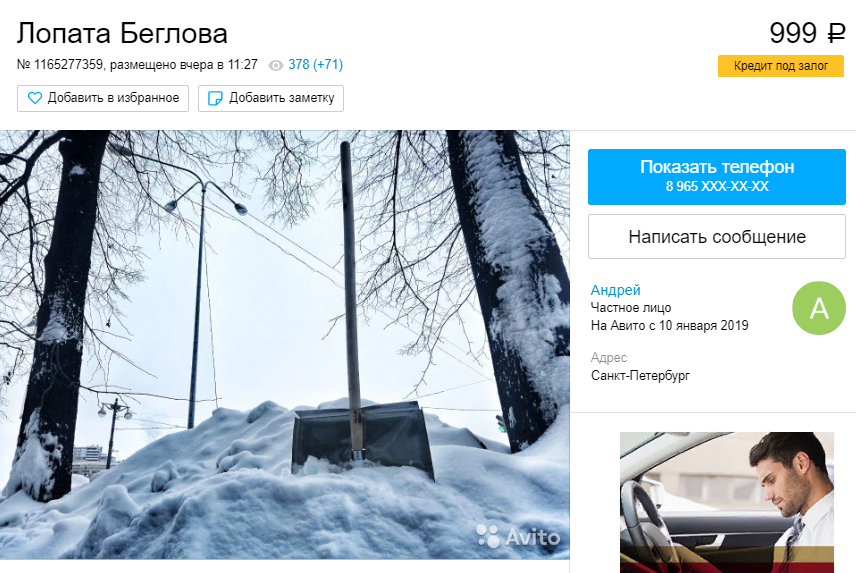 На следующий день объявление с предложением продажи «лопаты Беглова» появилось на «Авито». «Продается важный артефакт, необходимый каждому жителю Петербурга этой зимой. Помогает выйти на улицу и попасть в ваш автомобиль. Главе любого района СПб дает +50 к защите от внезапного увольнения», — говорится в объявлении.