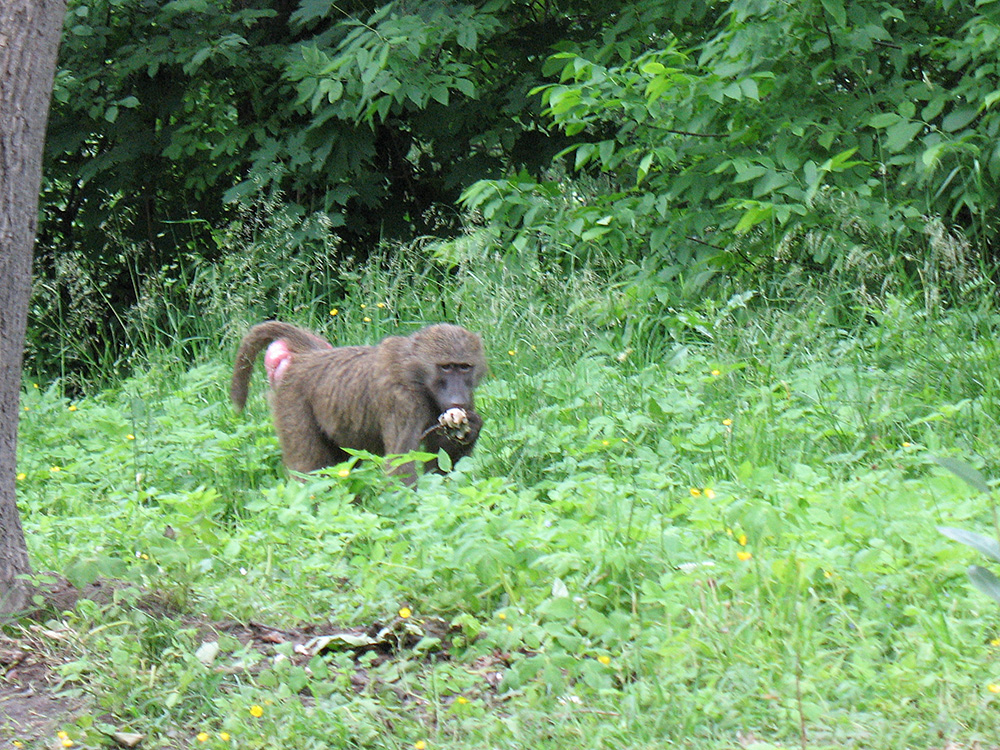 Обезьяны на Елагином появились в начале 2000-х. Сначала — макаки-лапундеры, а позднее павианы. Животных привозили на лето из Ленинградского зоопарка. Вокруг острова устанавливали ограждения и предупредительные знаки, чтобы люди не приближались к обезьянам слишком близко.