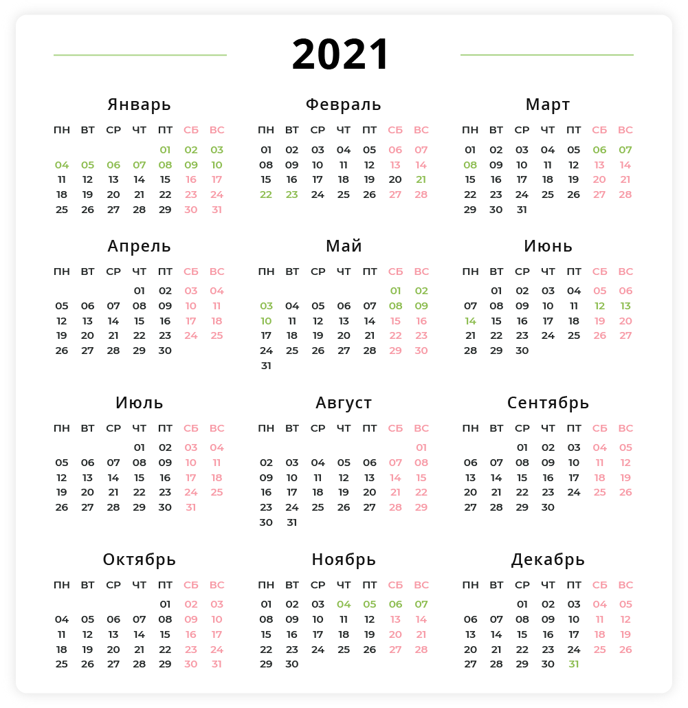 Правительство России определило дни, которые станут выходными в следующем году. Запланировано семь праздничных периодов: с 1 по 10 января, с 21 по 23 февраля, с 6 по 8 марта, с 1 по 3 мая, с 8 по 10 мая, с 12 по 14 июня и с 4 по 7 ноября. 23 апреля Владимир Путин также объявил нерабочими дни между майскими праздниками — с 4 по 7 мая. «Бумага» подготовила календарь, в котором отмечены официальные выходные 2021 года.