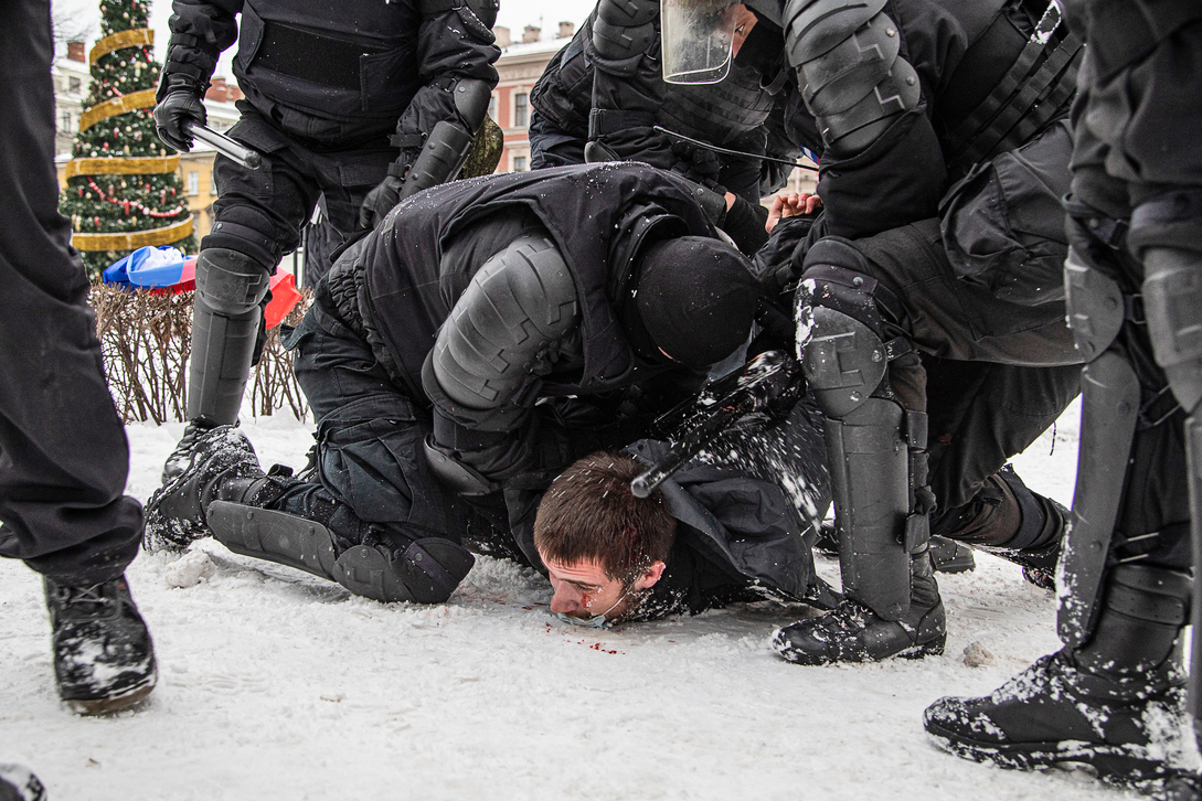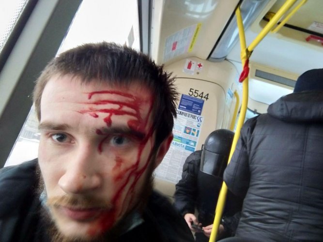 — Когда меня валили на землю, меня также [еще раз] ударили дубинкой по голове. Сильной боли я не почувствовал, потому что удар был скользящий, по касательной. В результате я получил рваную рану. Уже когда я лежал лицом вниз, пульс повысился, произошел приток крови к голове. Только тогда я заметил, что с моей головы что-то красное капает на белый снег. Уже потом, когда меня несли в автозак, я понял, что это хлещет кровь.