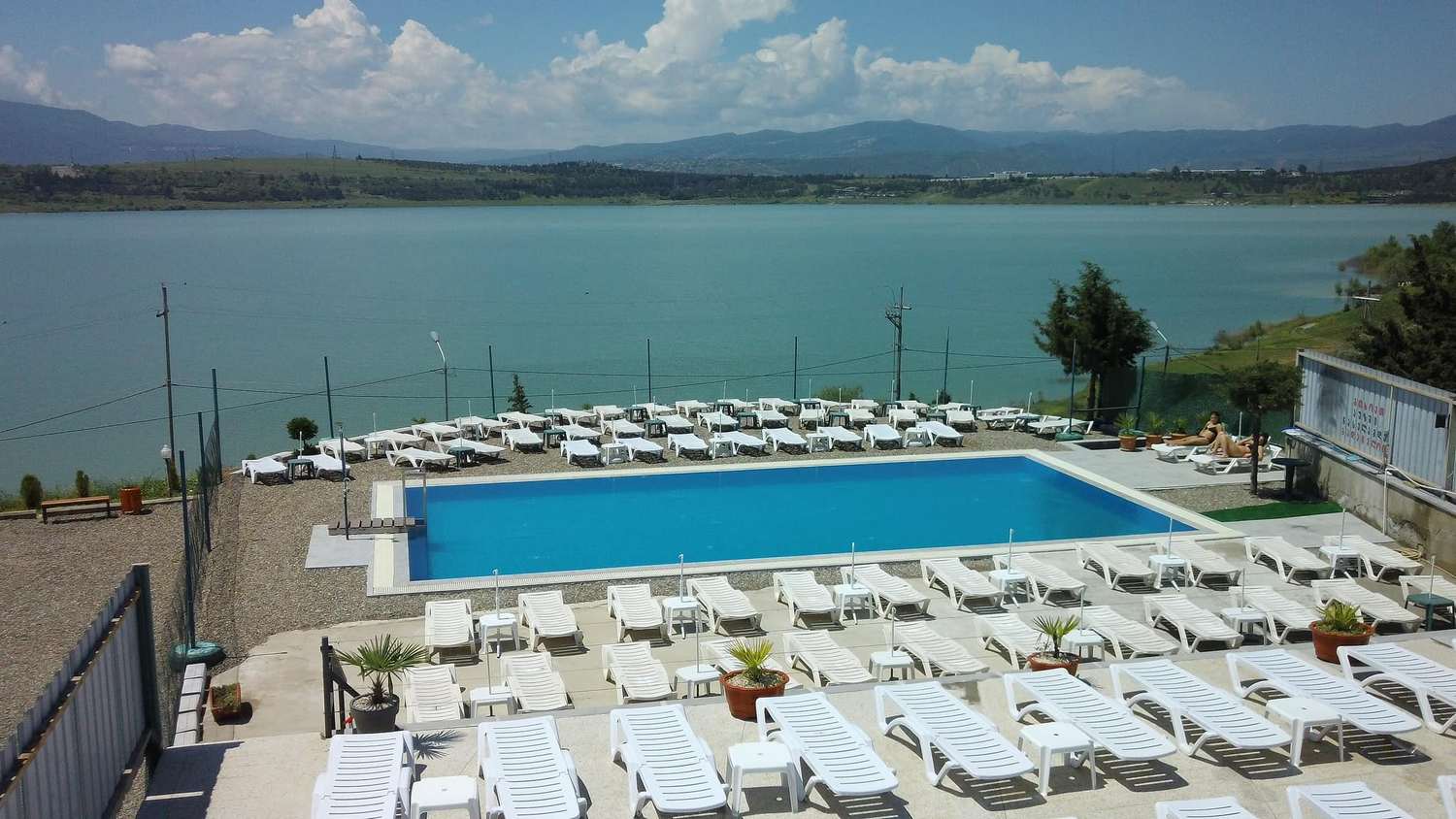Небольшой бассейн за Тбилисским морем. Здесь много шезлонгов и есть небольшой бар — в комментариях посетители хвалят холодный кофе.