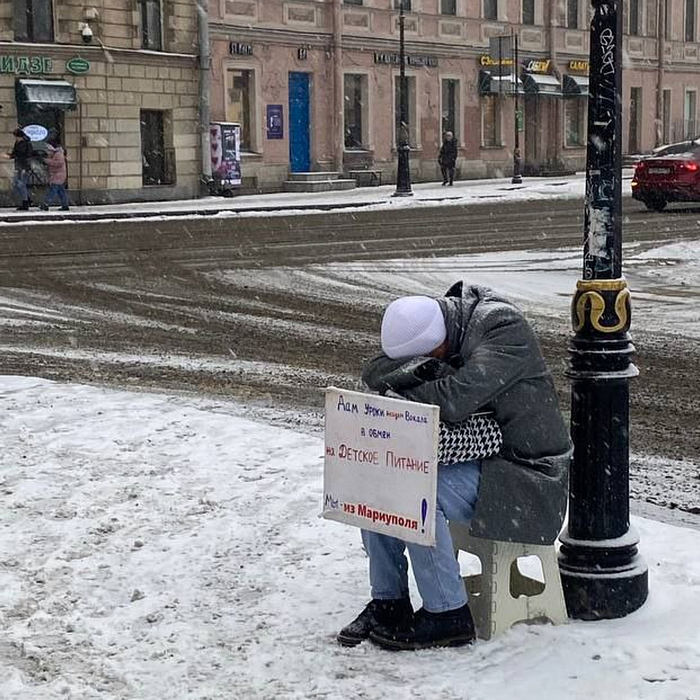 Зимой 2023 года на углу Моховой и Белинского в Петербурге появился мужчина — он часами сидел на морозе на раскладном стульчике с табличкой: «Дам уроки академического вокала в обмен на детское питание. Мы из Мариуполя!»